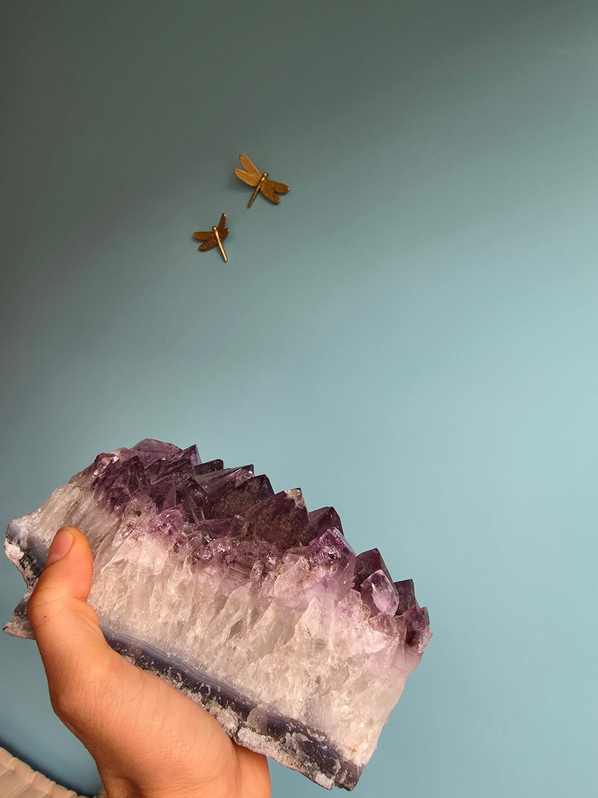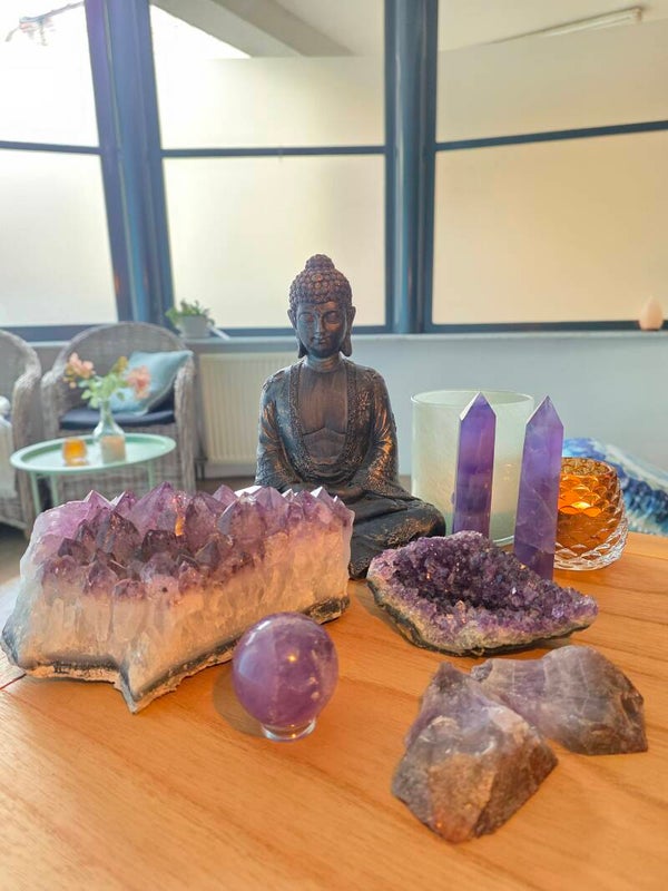 Amethist krachtcluster die emotionele rust brengt, spirituele helderheid versterkt en fysiek diepe ontspanning ondersteunt.
